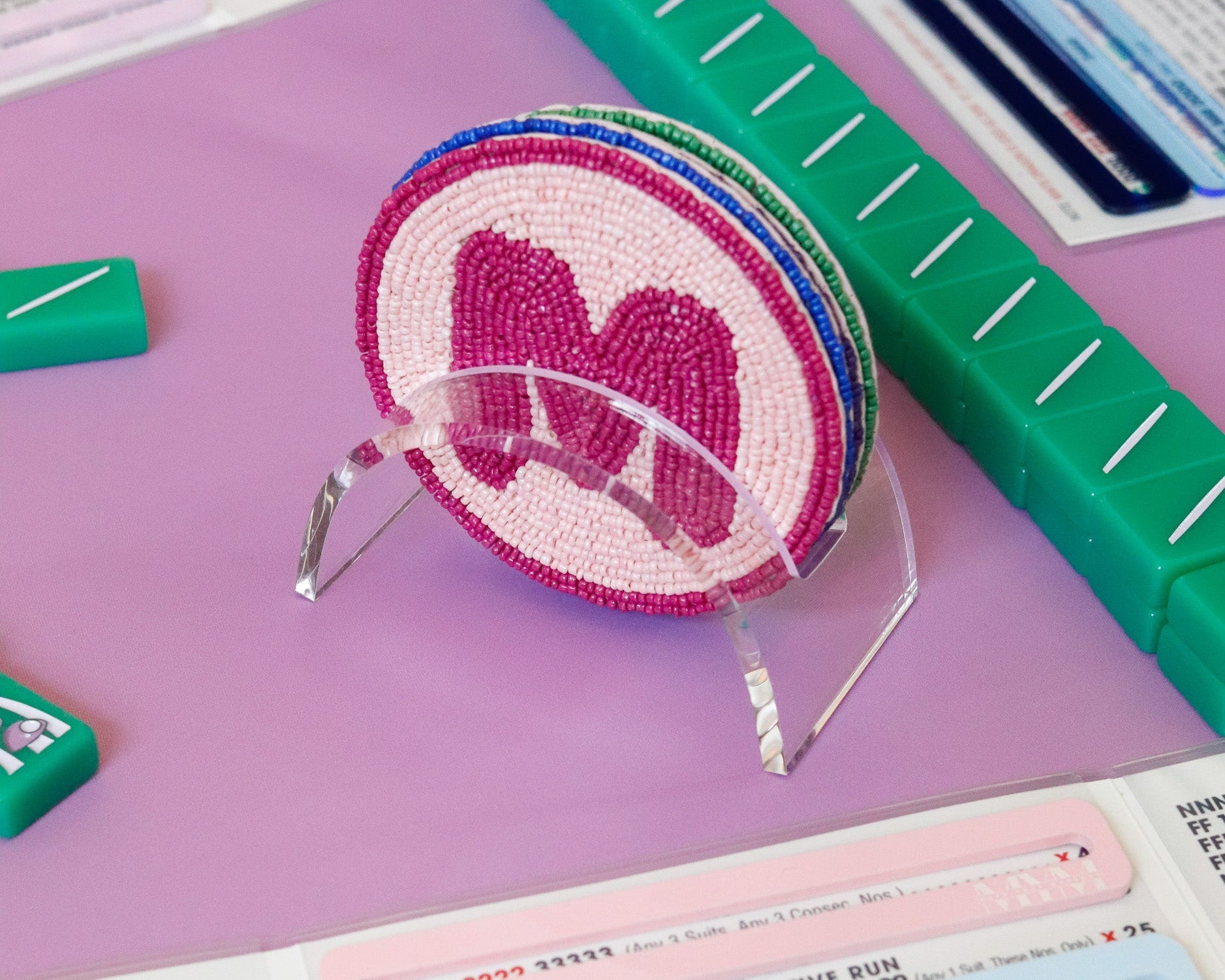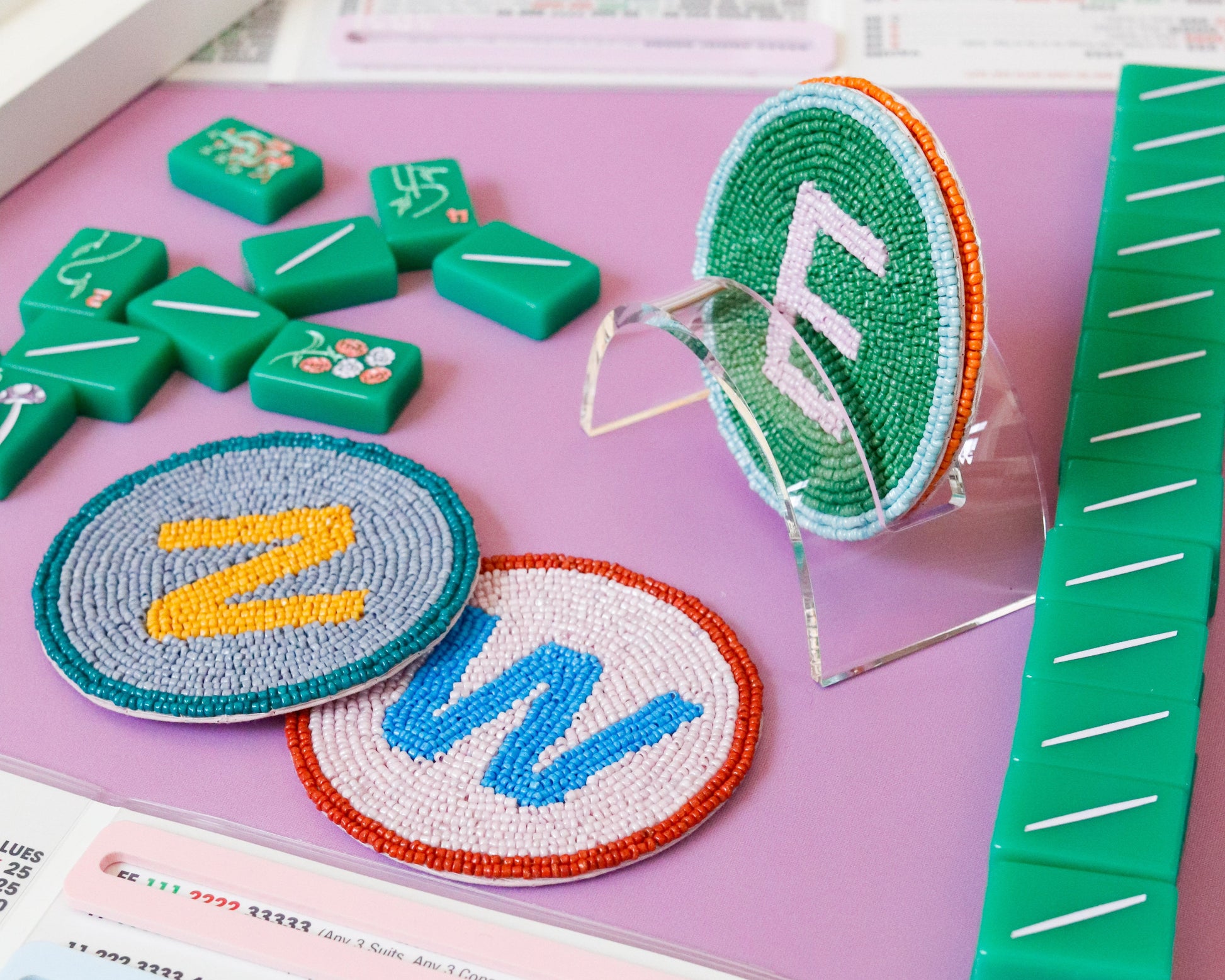 Give your coasters a beautiful place to live on your Mahjong table! Our new, custom-sized acrylic coaster displays are sized perfectly to hold up to four of our Round Hand-Beaded Coasters. This is the perfect way to show of these little works of art and also keep them organized while you're not playing Mahjong (even though we know that won't happen too often ;)