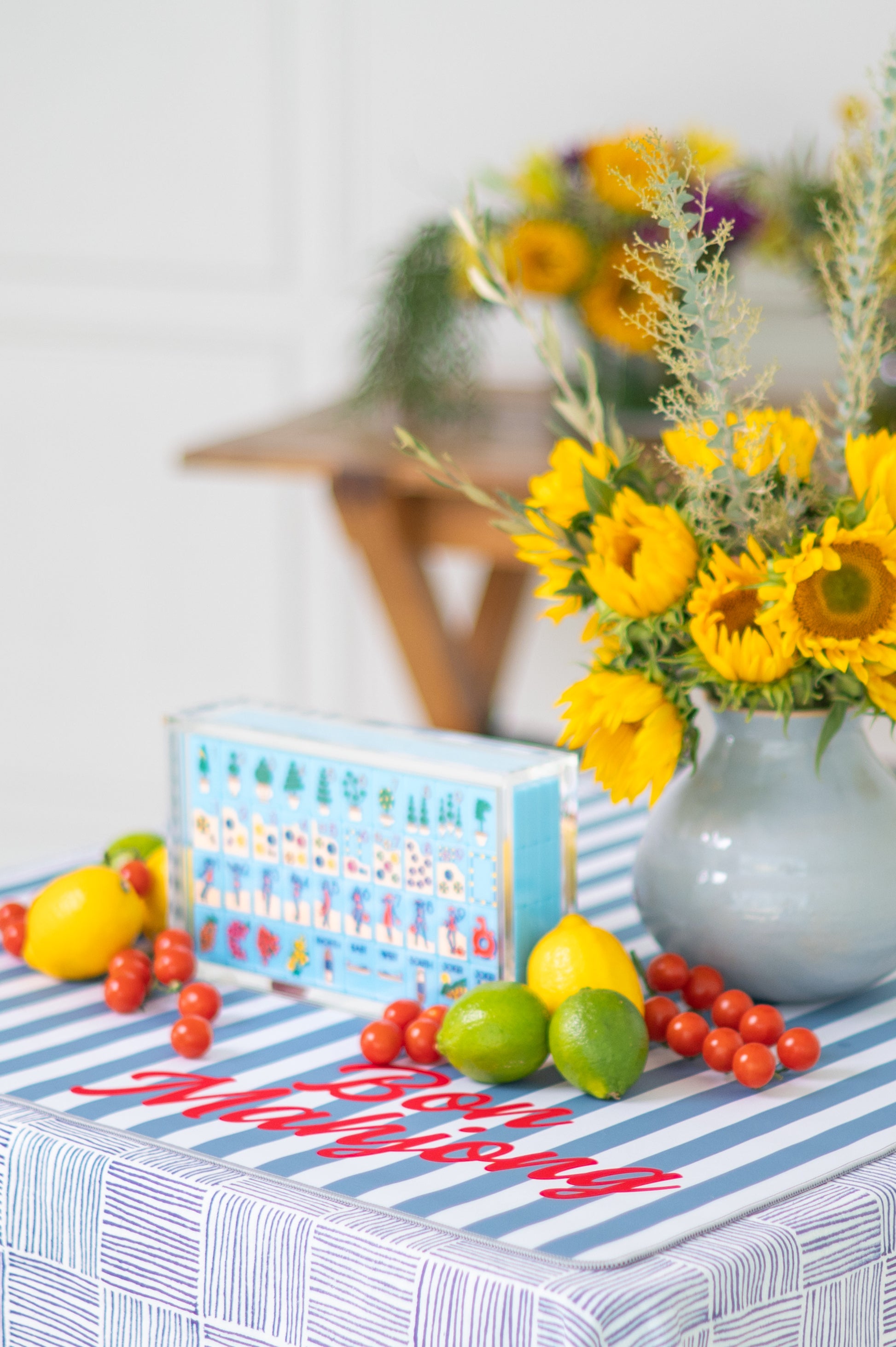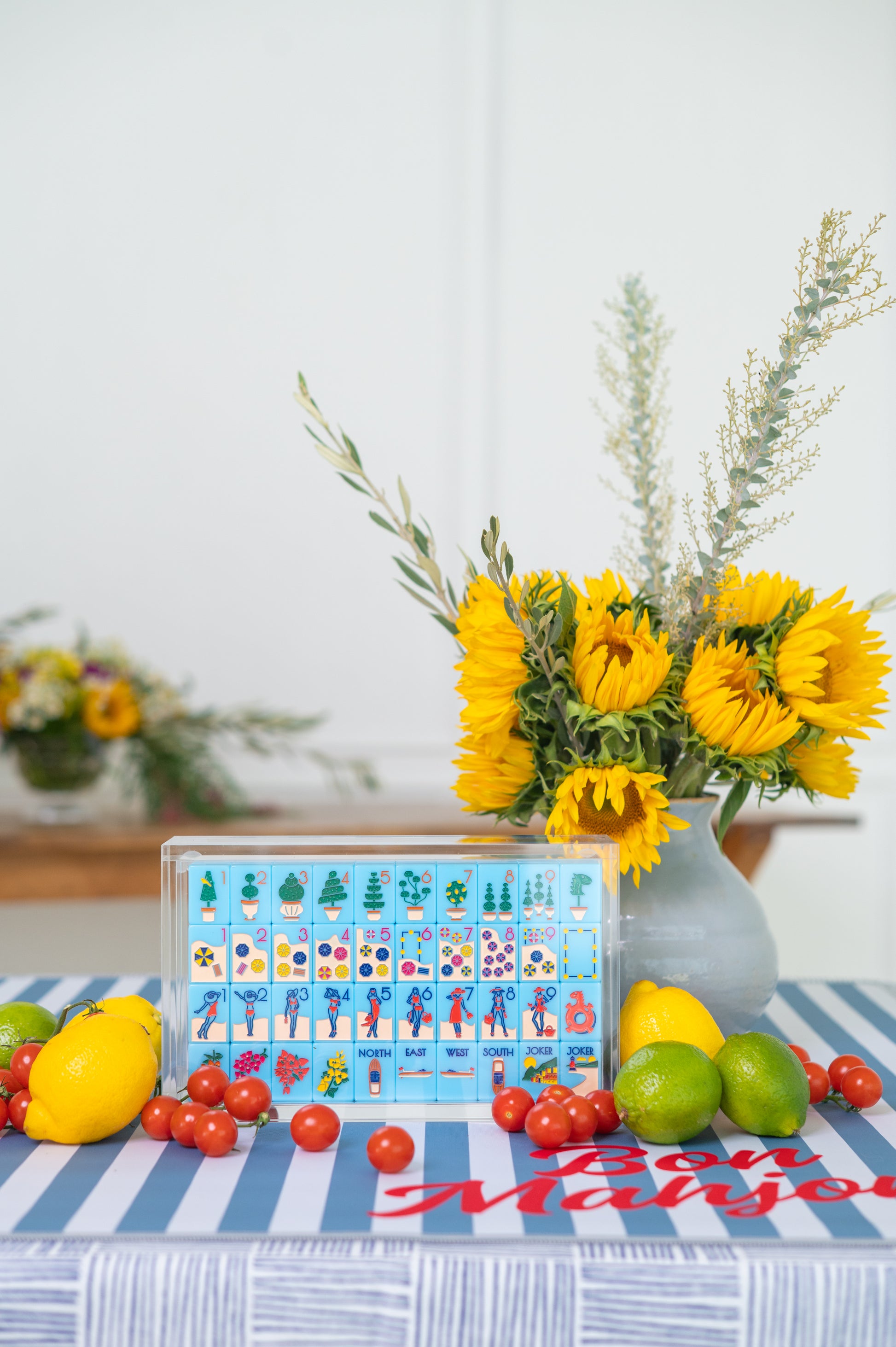 Fresh. Nautical. Unmistakably Riviera. This blue-and-white cabana stripe Mahjong mat channels the breezy elegance of Cannes and Saint-Tropez. Designed to elevate your American Mahjong game with clean lines and coastal sophistication, it features our signature “Bon Mahjong” inscription for that subtle South of France vacay vibe.