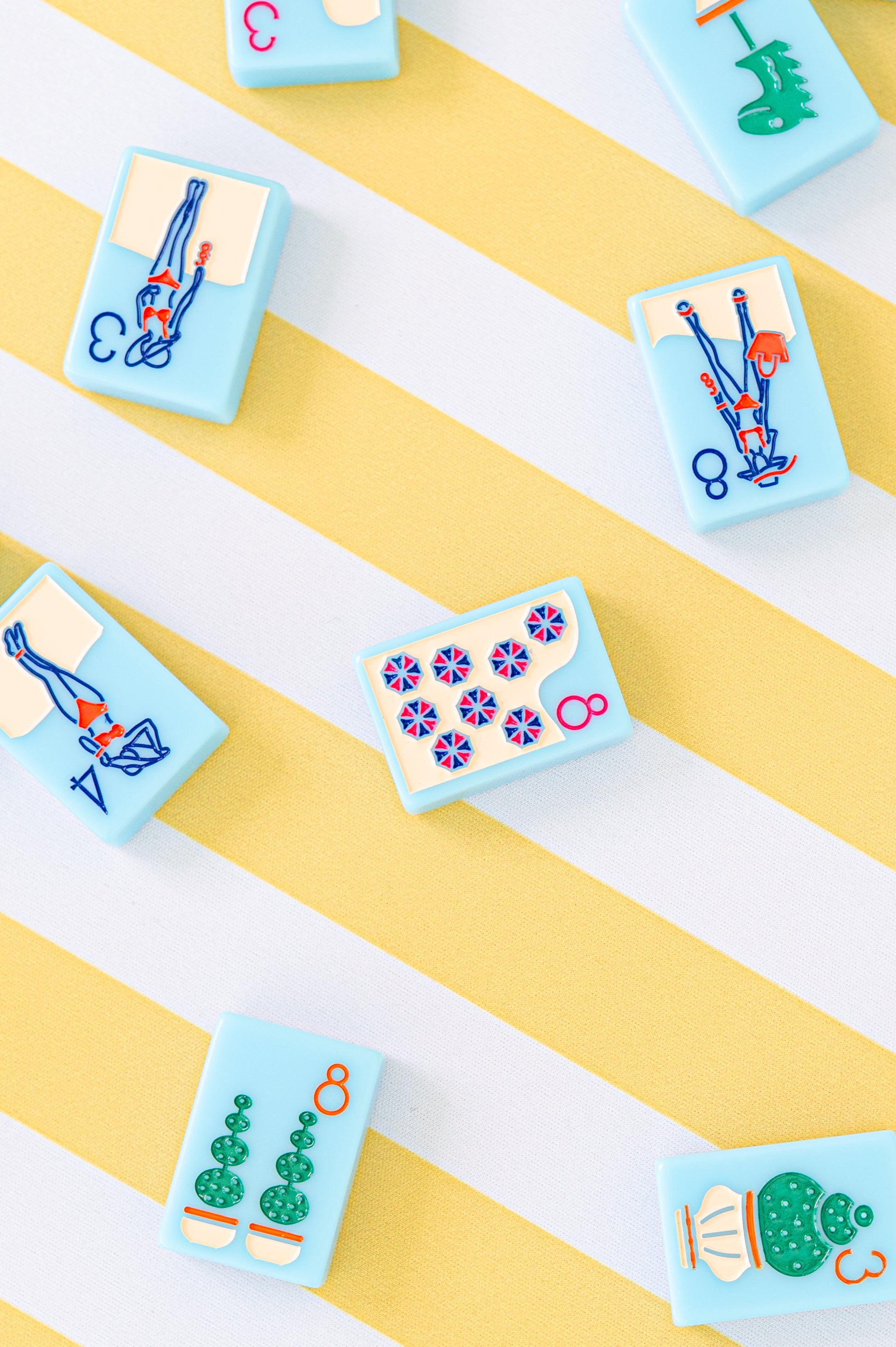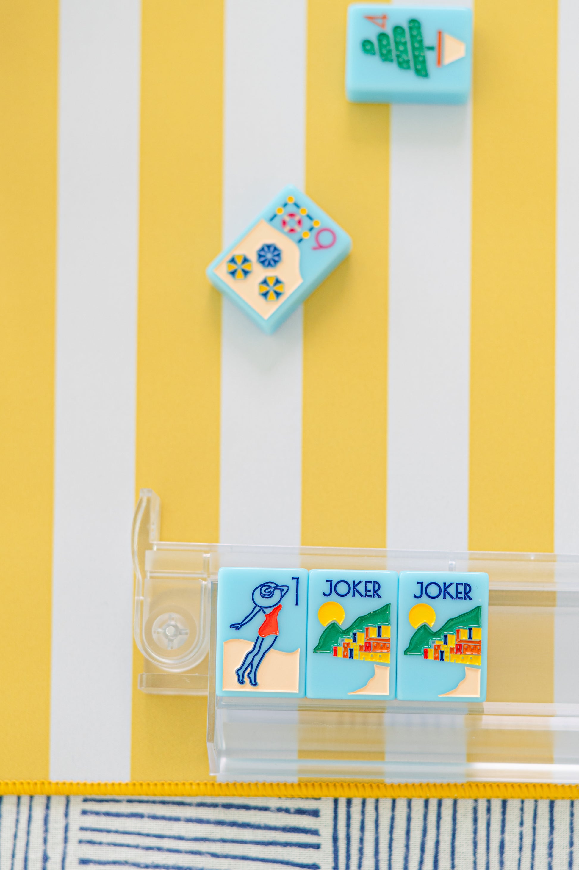 Quiet-luxury meets sunshine-soaked Riviera charm. Inspired by the iconic striped cabanas that line the beaches of the Côte d’Azur, this yellow-and-white American Mahjong mat brings a warm, golden glow to any game. The bold cabana stripe pattern feels effortless and elegant, while the “Bon Mahjong” corner detail adds the perfect touch of playful sophistication.