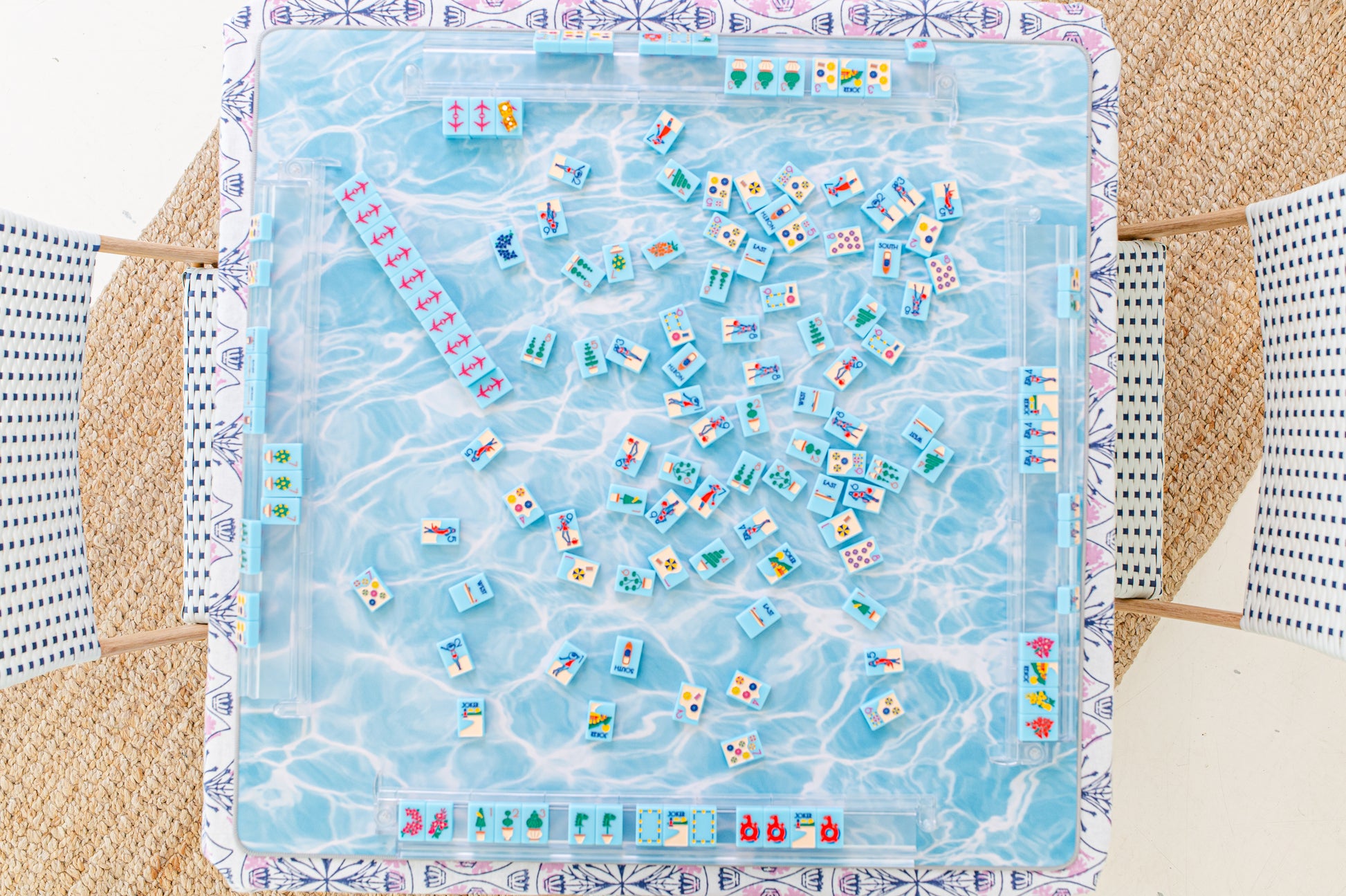 Our most immersive, transportive Mahjong mat yet. This shimmering aqua pool water design brings the calm, sparkling beauty of a Mediterranean pool right to your table. The layered light reflections create a hypnotic, serene backdrop straight out of vacation to instantly elevates the feel of your Mahjong setup.